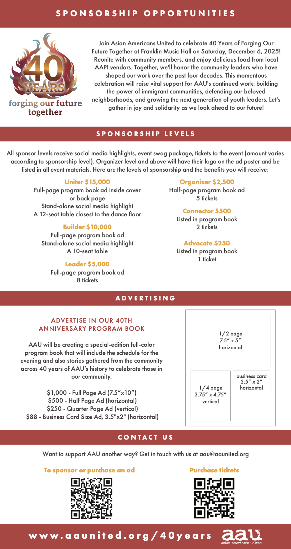 If you’d like to pay by check, please make it out to “Asian Americans United” and mail it to 1023 Callowhill Street, Philadelphia, PA 19123. In the Note, indicate which level of sponsorship or program book ad you’d like to purchase.