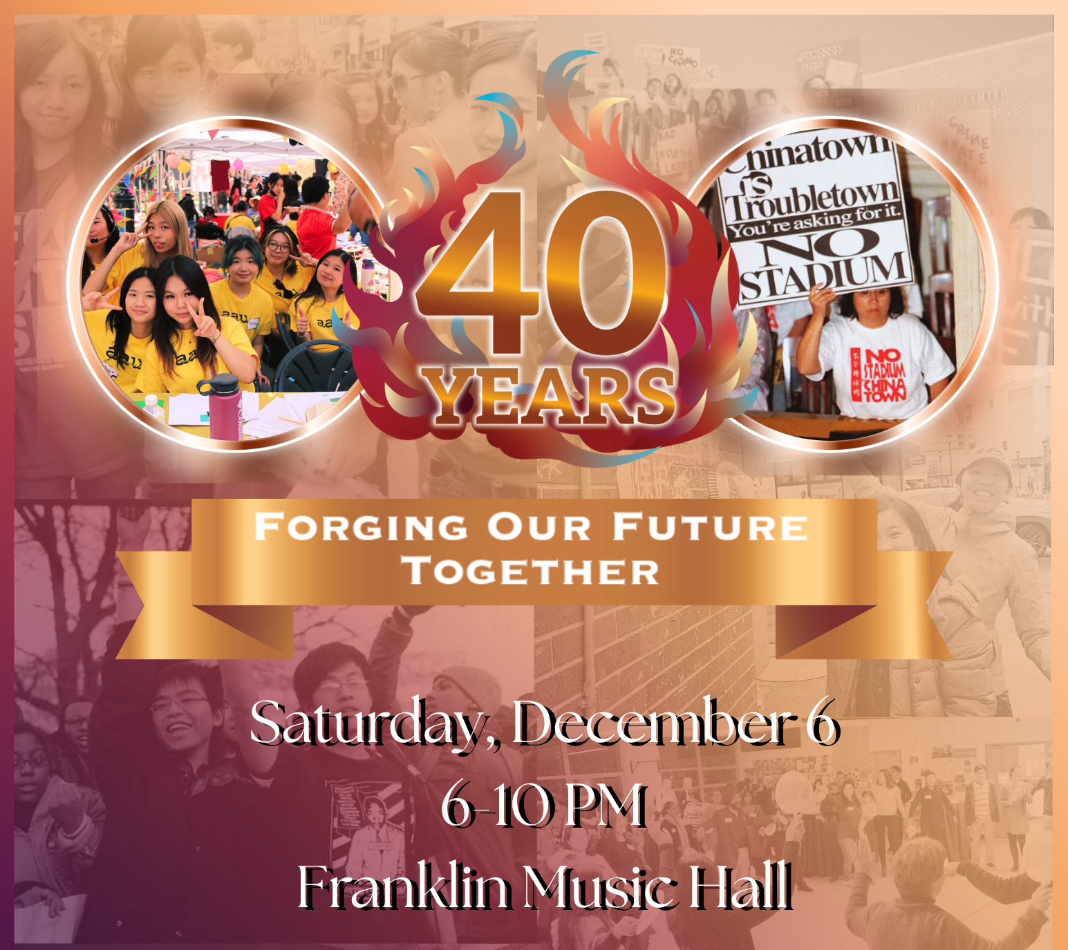Join Asian Americans United to celebrate 40 Years of Forging Our Future Together at Franklin Music Hall on Saturday, December 6, 2025! Reunite with community members, and enjoy delicious food from local AAPI vendors. Together, we'll honor the community leaders who have shaped our work over the past four decades. This momentous celebration will raise vital support for AAU's continued work: building the power of immigrant communities, defending our beloved neighborhoods, and growing the next generation of youth leaders. Let's gather in joy and solidarity as we look ahead to our future!